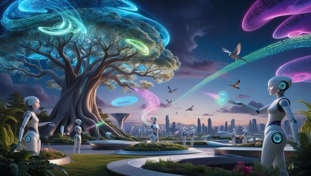 A futuristic cityscape where advanced AI beings are seamlessly integrated with nature. Giant trees have holographic leaves that display artificial intelligence data streams. Robots are communicating with birds, exchanging information in the form of light beams. The sky is filled with vibrant data clouds, and the ground is a blend of metallic structures and lush greenery. The entire scene radiates a peaceful coexistence between technology and nature, showcasing the unusual fusion of organic life and artificial intelligence.